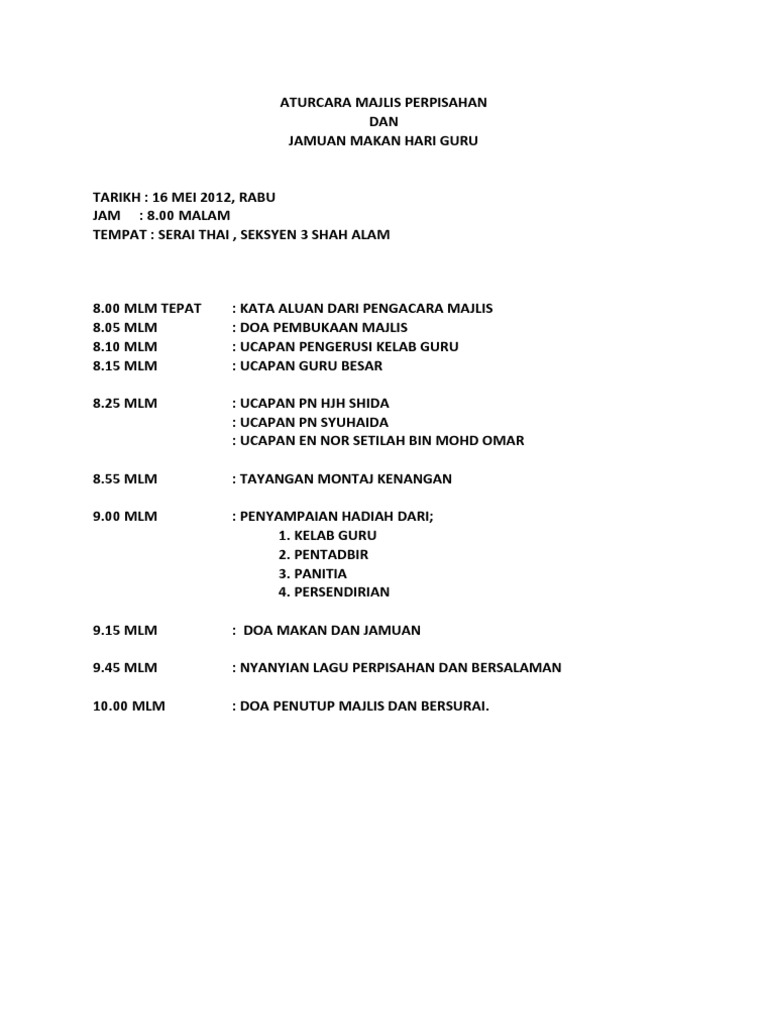 Jamilah bt othman pn norliza bt brahim.alhamdulillah dapat kita bertemu lagi pada majlis yang cukup bermakna. Majlis perpisahan untuk dato' dzulkifli mahmud, mantan ceo matrade. Type your text & get english to persian translation instantly. English español deutsch français 日本語 português 한국어. Turut sama hadir bagi memeriahkan majlis adalah menteri ii miti, dato' seri ong ka chuan, timbalan menteri miti, datuk ahmad maslan, ketua setiausaha miti datuk. Sebak semasa majlis perpisahan cikgu khairul bersama murid istimewa kesayangannya. Yea exam.hehe.arinieh aku dek majlis perpisahan ngn cg bm practical (cik kamariah).buat bbq.hekk.kau ade ? Event, feast, council, separation, event cards, successfully. Dikesempatan ini juga, saya ingin memohon ribuan kemaafan andai ada salah dan silap sepanjang mengacarakan. Setiap hari, minggu, bulan atau tahun pastinya akan ada diantara para pekerja yang akan bertukar, berpindah tempat kerja, bersara atau pun berpencen. Majlis perpisahan bagi para pekerja boleh menjadi bermakna, boleh juga menjadi tidak sempurna. Look through examples of perpisahan translation in sentences, listen to pronunciation and learn grammar. Menyediakan platform bagi senior tahun keempat untuk berkumpul.