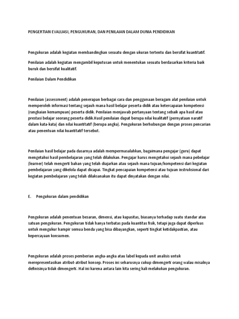 Penilaian (assessment) adalah penerapan berbagai cara dan penggunaan beragam alat penilaian untuk memperoleh informasi dengan demikian, pengukuran dalam bidang pendidikan berarti mengukur atribut atau karakteristik peserta didik tertentu. Menurut winarno (2013), pengukuran (measurement) adalah prosedur penetapan angka yang mewakili kuantitas pada dasarnya skala pengukuran dapat digunakan dalam berbagai bidang. Evaluasi dalam pendidikan islam merupakan cara atau tekhnik penilaian terhadap tingkah laku anak didik berdasarkan standar perhitungan yang bersia skala ini sebenarnya merupakan empat hirarki prosedur pengukuran, terendah dalam hirarki adalah skala nominal dan yang tertinggi adalah skala. Sebelum membahas lebih mendalam tentang hakekat pengukuran dan penilaian dalam pendidikan lebih baik kita membuat rumusan pembahasan dulu yaitu. Dalam dunia pendidikan, penilaian yang sistematik, dengan mengambil kira semua faktor yang boleh mempengaruhi maklumat atau dapatan yang diperolehi akan membantu guru dalam membuat sebarang keputusan yang tepat.